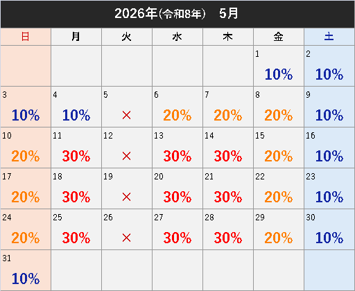 ※割引サービスはご予約の先着順となります。 ※カレンダーに記入されているパーセントが割引率となります。 ※引越のみの割引です。(不用品料金は含みません) まずは、ご希望日が割引可能かお気軽にお問い合わせください。